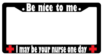 Be Nice To Me I May Be Your Nurse WHITE (Design 2a) Black Plastic License Frame Be Nice To Me I Might Be Your Nurse Someday Black license plate frame made from high impact ABS plastic, covered with color vinyl printing. This frame is designed to last. These frames will last longer than your car.