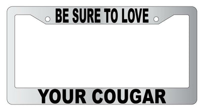 Be Sure To Love Your Cougar Chrome Plastic License Plate Frame Be Sure To Love Your Cougar Chrome Plastic License Plate Frame Description Be Sure To Love Your Cougar Chrome Plastic license plate frame made from high impact ABS plastic, chrome plated, and covered with color vinyl printing. This frame is designed to last. Steel chrome frames when they get scratched will rust and rot away. These frames will last longer than your car.