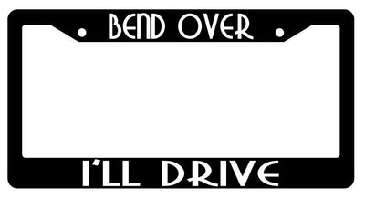 Bend Over I'll Drive Black Plastic License Plate Frame Bend Over I'll Drive Black Plastic License Plate Frame Description Bend Over I'll Drive Black Plastic License Plate Frame Black license plate frame made from high impact ABS plastic, covered with color vinyl printing. This frame is designed to last. These frames will last longer than your car.