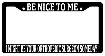 Black License Frame Be Nice to Me I Might Be Your Orthopedic-Surgeon Someday Be Nice to Me I Might Be Your Orthopedic-Surgeon Black license plate frame made from high impact ABS plastic, covered with color vinyl printing. This frame is designed to last. These frames will last longer than your car.