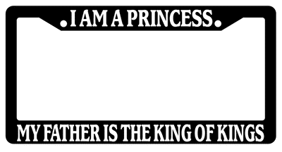 Black License Plate I Am A Princess My Father Is The King Of Kings Christian I Am A Princess My Father Is The King Of Kings Black license plate frame made from high impact ABS plastic, covered with color vinyl printing. This frame is designed to last. These frames will last longer than your car.