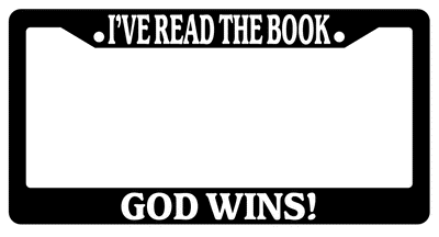Black License Plate Frame I've Read The Book God Wins! Auto Accessory Christian I've Read The Book God Wins! Black license plate frame made from high impact ABS plastic, covered with color vinyl printing. This frame is designed to last. These frames will last longer than your car.