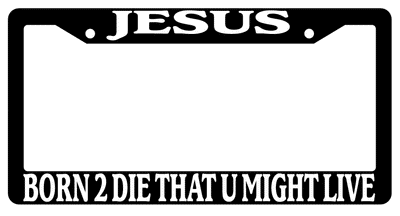 Black License Plate Frame Jesus Born To Die That You Might Live Christian Auto Jesus Born To Die That You Might Live Black license plate frame made from high impact ABS plastic, covered with color vinyl printing. This frame is designed to last. These frames will last longer than your car.