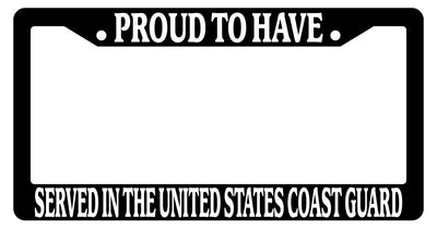 Black License Plate Frame Proud To Have Served In The United States Coast Guard Proud To Have Served In The United States Coast Guard Black license plate frame made from high impact ABS plastic, covered with color vinyl printing. This frame is designed to last. These frames will last longer than your car.