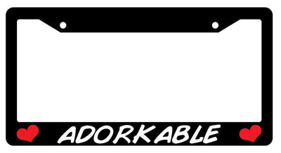 Black License Plate Frame ADORKABLE w/HEARTS Auto Accessory Black license plate frame ADORKABLE w/HEARTS made from high impact ABS plastic, covered with color vinyl printing. This frame is designed to last. These frames will last longer than your car.