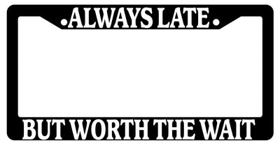 Black License Plate Frame "Always Late But Worth The Wait" Auto Accessory Novelt Always Late But Worth The Wait Black license plate frame made from high impact ABS plastic, covered with color vinyl printing. This frame is designed to last. These frames will last longer than your car.