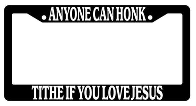 Black License Plate Frame ANYONE CAN HONK TITHE IF YOU LOVE JESUS Auto Accessory Black license plate frame ANYONE CAN HONK TITHE IF YOU LOVE JESUS made from high impact ABS plastic, covered with color vinyl printing. This frame is designed to last. These frames will last longer than your car.