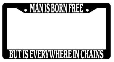 Black License Plate Frame Auto Accessory Man-Is-Born-Free Black License Plate Frame Auto Accessory Man-Is-Born-Free made from high impact ABS plastic, covered with color vinyl printing. This frame is designed to last. These frames will last longer than your car.
