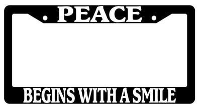 Black License Plate Frame Auto Accessory Peace-Begins Black License Plate Frame Auto Accessory Peace-Begins Black License Plate Frame Auto Accessory Peace-Begins made from high impact ABS plastic, covered with color vinyl printing. This frame is designed to last. These frames will last longer than your car.