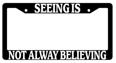 Black License Plate Frame Auto Accessory Seeing-Is Black License Plate Frame Auto Accessory Seeing-Is made from high impact ABS plastic, covered with color vinyl printing. This frame is designed to last. These frames will last longer than your car.