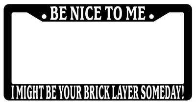 Black License Plate Frame Be Nice to Me I Might Be Your Brick Layer Someday Be Nice to Me I Might Be Your Brick Layer Black license plate frame made from high impact ABS plastic, covered with color vinyl printing. This frame is designed to last. These frames will last longer than your car.