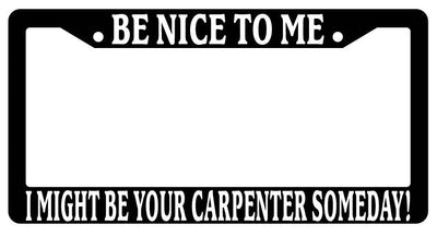 Black License Plate Frame Be Nice to Me I Might Be Your Carpenter Someday Be Nice to Me I Might Be Your Carpenter Black license plate frame made from high impact ABS plastic, covered with color vinyl printing. This frame is designed to last. These frames will last longer than your car.