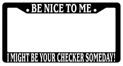 Black License Plate Frame Be Nice to Me I Might Be Your Checker Someday Be Nice to Me I Might Be Your Checker Black license plate frame made from high impact ABS plastic, covered with color vinyl printing. This frame is designed to last. These frames will last longer than your car.