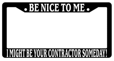 Black License Plate Frame Be Nice to Me I Might Be Your Contractor Someday Be Nice to Me I Might Be Your Contractor Black license plate frame made from high impact ABS plastic, covered with color vinyl printing. This frame is designed to last. These frames will last longer than your car.
