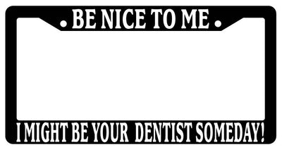 Black License Plate Frame Be Nice to Me I Might Be Your Dentist Someday Be Nice to Me I Might Be Your Dentist Black license plate frame made from high impact ABS plastic, covered with color vinyl printing. This frame is designed to last. These frames will last longer than your car.