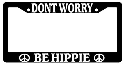 Black License Plate Frame "Don't Worry Be A Hippie" Auto Accessory Novelty Don't Worry Be A Hippie Black license plate frame made from high impact ABS plastic, covered with color vinyl printing. This frame is designed to last. These frames will last longer than your car.