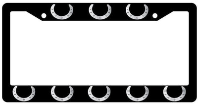 Black License Plate Frame "Horseshoes" Auto Accessory Novelty Gifts " Horseshoes " Black l icense plate frame made from high impact platable ABS. Covered with color vinyl printing. This frame is designed to last. Steel chrome frames when they get scratched will rust and rot away. These frames will last longer than your car.