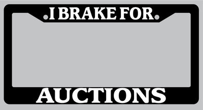 Black License Plate Frame "I Brake For Auctions" Auto Accessory Novelty I Brake For Auctions Black license plate frame made from high impact ABS plastic, covered with color vinyl printing. This frame is designed to last. These frames will last longer than your car.