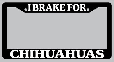 Black License Plate Frame "I Brake For Chihuahuas" Auto Accessory Novelty I Brake For Chihuahuas Black license plate frame made from high impact ABS plastic, covered with color vinyl printing. This frame is designed to last. These frames will last longer than your car.