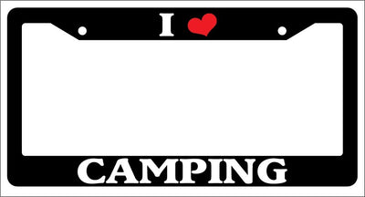 Black License Plate Frame "I Heart Camping" Auto Accessory Novelty I Heart Camping Black license plate frame made from high impact ABS plastic, covered with color vinyl printing. This frame is designed to last. These frames will last longer than your car.