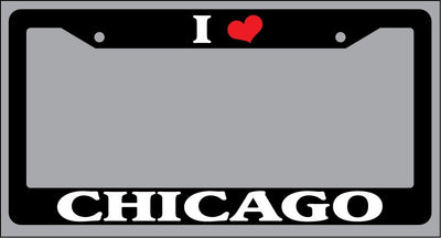 Black License Plate Frame "I Heart Chicago" Auto Accessory Novelty I Heart Chicago Black license plate frame made from high impact ABS plastic, covered with color vinyl printing. This frame is designed to last. These frames will last longer than your car.