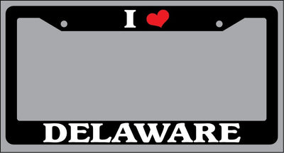 Black License Plate Frame "I Heart Delaware" Auto Accessory Novelty I Heart Delaware Black license plate frame made from high impact ABS plastic, covered with color vinyl printing. This frame is designed to last. These frames will last longer than your car.