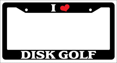 Black License Plate Frame "I Heart Disk Golf" Auto Accessory Novelty I Heart Disk Golf Black license plate frame made from high impact ABS plastic, covered with color vinyl printing. This frame is designed to last. These frames will last longer than your car.