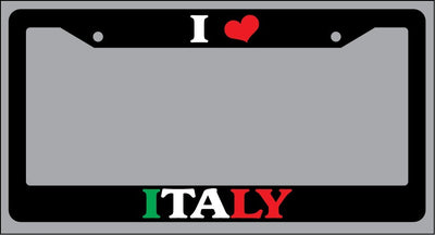 Black License Plate Frame "I Heart Italy Color" Auto Accessory Novelty I Heart Italy Color Black license plate frame made from high impact ABS plastic, covered with color vinyl printing. This frame is designed to last. These frames will last longer than your car.
