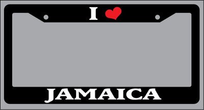 Black License Plate Frame "I Heart Jamaica" Auto Accessory Novelty I Heart Jamaica Black license plate frame made from high impact ABS plastic, covered with color vinyl printing. This frame is designed to last. These frames will last longer than your car.