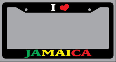 Black License Plate Frame "I Heart Jamaica Color" Auto Accessory Novelty I Heart Jamaica Color Black license plate frame made from high impact ABS plastic, covered with color vinyl printing. This frame is designed to last. These frames will last longer than your car.