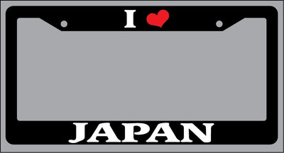 Black License Plate Frame "I Heart Japan" Auto Accessory Novelty I Heart Japan Black license plate frame made from high impact ABS plastic, covered with color vinyl printing. This frame is designed to last. These frames will last longer than your car.