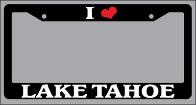 Black License Plate Frame "I Heart Lake Tahoe" Auto Accessory Novelty I Heart Lake Tahoe Black license plate frame made from high impact ABS plastic, covered with color vinyl printing. This frame is designed to last. These frames will last longer than your car.