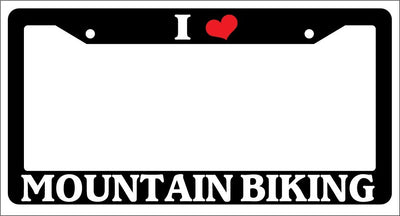 Black License Plate Frame "I Heart Mountain Biking" Auto Accessory Novelty I Heart Mountain Biking Black license plate frame made from high impact ABS plastic, covered with color vinyl printing. This frame is designed to last. These frames will last longer than your car.