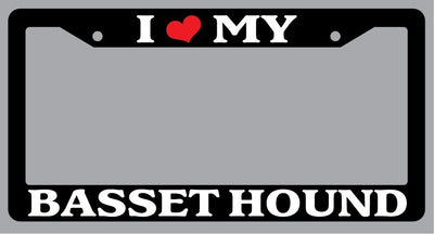 Black License Plate Frame "I Heart My Basset Hound" Auto Accessory Novelty I Heart My Basset Hound Black license plate frame made from high impact ABS plastic, covered with color vinyl printing. This frame is designed to last. These frames will last longer than your car.