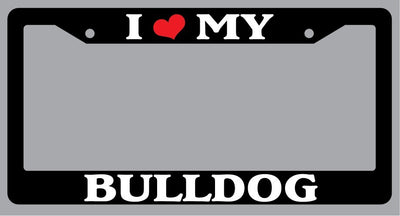 Black License Plate Frame "I Heart My Bulldog" Auto Accessory Novelty I Heart My Bulldog Black license plate frame made from high impact ABS plastic, covered with color vinyl printing. This frame is designed to last. These frames will last longer than your car.
