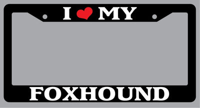 Black License Plate Frame "I Heart My Foxhound" Auto Accessory Novelty I Heart My Foxhound Black license plate frame made from high impact ABS plastic, covered with color vinyl printing. This frame is designed to last. These frames will last longer than your car.