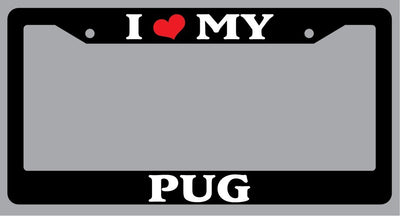 Black License Plate Frame "I Heart My Pug" Auto Accessory Novelty I Heart My Pug Black license plate frame made from high impact ABS plastic, covered with color vinyl printing. This frame is designed to last. These frames will last longer than your car.
