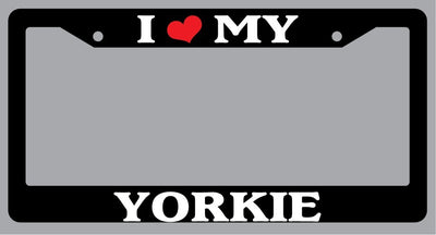 Black License Plate Frame "I Heart My Yorkie" Auto Accessory Novelty I Heart My Yorkie Black license plate frame made from high impact ABS plastic, covered with color vinyl printing. This frame is designed to last. These frames will last longer than your car.