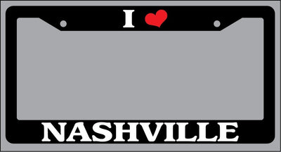 Black License Plate Frame "I Heart Nashville" Auto Accessory Novelty I Heart Nashville Black license plate frame made from high impact ABS plastic, covered with color vinyl printing. This frame is designed to last. These frames will last longer than your car.
