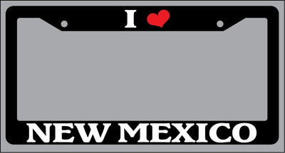 Black License Plate Frame "I Heart New Mexico" Auto Accessory Novelty I Heart New Mexico Black license plate frame made from high impact ABS plastic, covered with color vinyl printing. This frame is designed to last. These frames will last longer than your car.