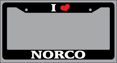 Black License Plate Frame "I Heart Norco" Auto Accessory Novelty I Heart Norco Black license plate frame made from high impact ABS plastic, covered with color vinyl printing. This frame is designed to last. These frames will last longer than your car.