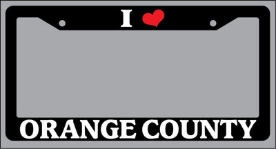 Black License Plate Frame "I Heart Orange County" Auto Accessory Novelty I Heart Orange County Black license plate frame made from high impact ABS plastic, covered with color vinyl printing. This frame is designed to last. These frames will last longer than your car.