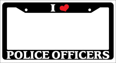 Black License Plate Frame "I Heart Police Officers" Auto Accessory Novelty I Heart Police Officers Black license plate frame made from high impact ABS plastic, covered with color vinyl printing. This frame is designed to last. These frames will last longer than your car.
