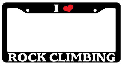 Black License Plate Frame "I Heart Rock Climbing" Auto Accessory Novelty I Heart Rock Climbing Black license plate frame made from high impact ABS plastic, covered with color vinyl printing. This frame is designed to last. These frames will last longer than your car.