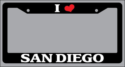 Black License Plate Frame "I Heart San Diego" Auto Accessory Novelty I Heart San Diego Black license plate frame made from high impact ABS plastic, covered with color vinyl printing. This frame is designed to last. These frames will last longer than your car.