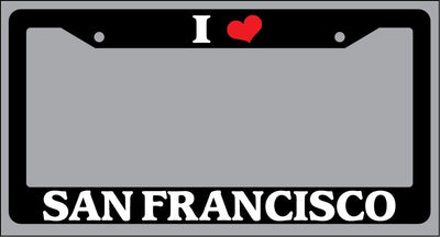 Black License Plate Frame "I Heart San Francisco" Auto Accessory Novelty I Heart San Francisco Black license plate frame made from high impact ABS plastic, covered with color vinyl printing. This frame is designed to last. These frames will last longer than your car.