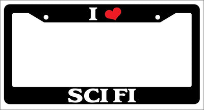 Black License Plate Frame "I Heart Sci Fi" Auto Accessory Novelty I Heart Sci Fi Black license plate frame made from high impact ABS plastic, covered with color vinyl printing. This frame is designed to last. These frames will last longer than your car.