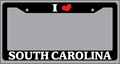 Black License Plate Frame "I Heart South Carolina" Auto Accessory Novelty I Heart South Carolina Black license plate frame made from high impact ABS plastic, covered with color vinyl printing. This frame is designed to last. These frames will last longer than your car.