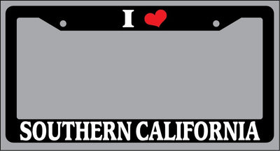 Black License Plate Frame "I Heart Southern California" Auto Accessory Novelty I Heart Southern California Black license plate frame made from high impact ABS plastic, covered with color vinyl printing. This frame is designed to last. These frames will last longer than your car.