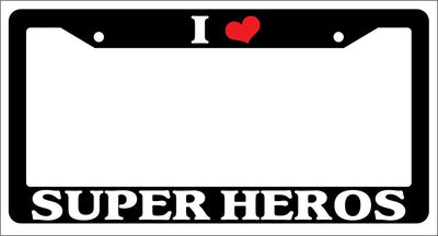 Black License Plate Frame "I Heart Super Heros" Auto Accessory Novelty I Heart Super Heros Black license plate frame made from high impact ABS plastic, covered with color vinyl printing. This frame is designed to last. These frames will last longer than your car.